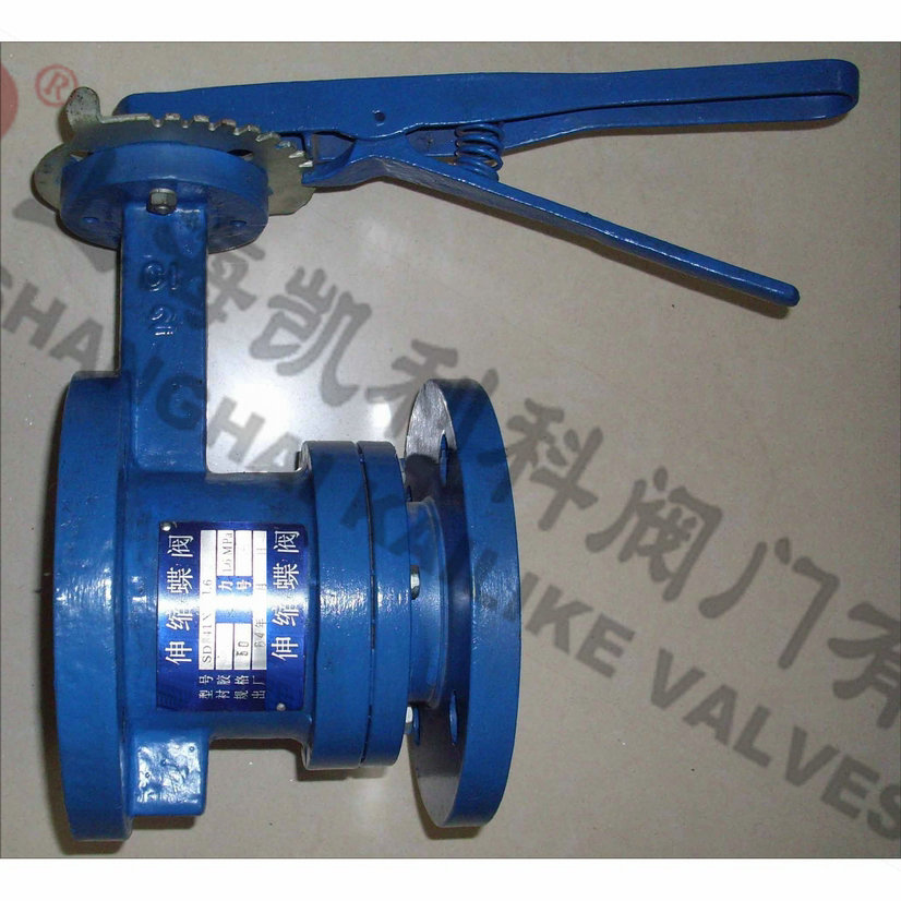 SD41X/SD43H手动法兰式伸缩蝶阀具有自动补偿管道热胀冷缩方便装卸的功能,使用于温度在425℃以下,公称压力在1.6MPa以下的石油、化工、电力、造纸、给排水和市政建设等工业管道上作调节流量和载断流体的最佳装置。