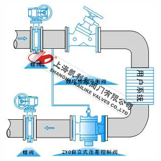 4、便流量的水平之平、干管入口处以及在安装温控阀、调节阀等的动态系统的支、干管入口处、安装自立式压差控制阀可使被控系统、回水管之间的压差保持恒定值。