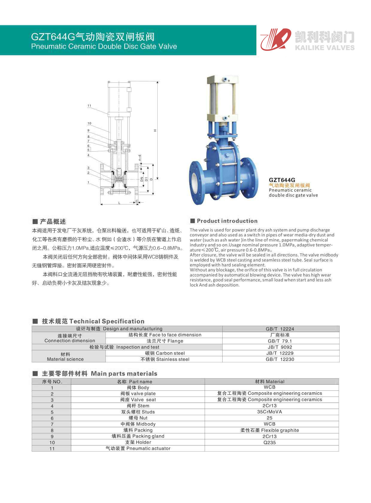 气动陶瓷双闸板阀关闭后任何方向全部密封。阀体中间体采用WCB铸钢件及无缝钢管焊接。密封面采用硬密封件。